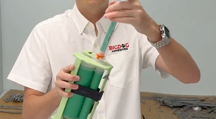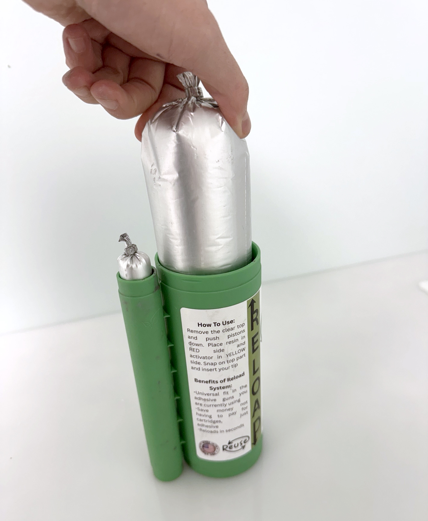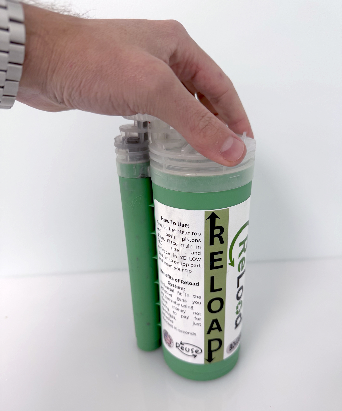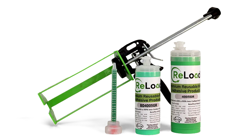 ReLoad the cartridge when all adhesive has been used. Remove the cartridge from the gun, snap off the clear top, and use your fingers or pliers to pull out the used foil pods. Flip the green shell, insert the correct resin and activator pods, remove the old tip, then snap the clear top back on. Place the cartridge into the gun, make sure the pods are punctured, and purge material before attaching a new tip and starting to dispense.