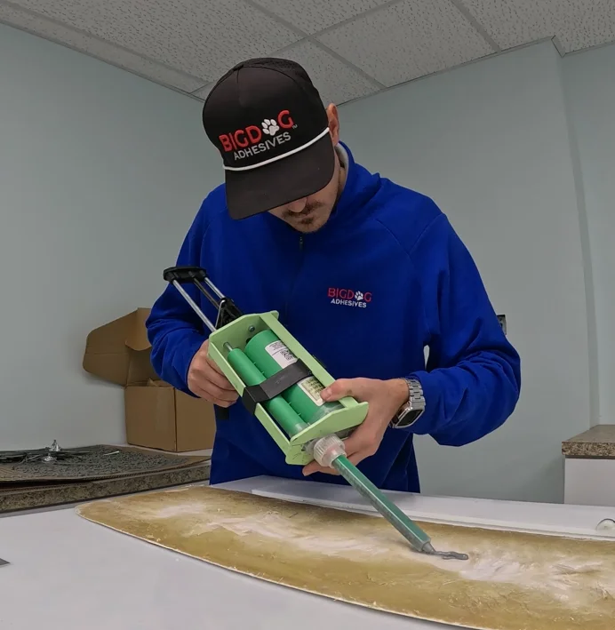Using your manual or pneumatic glue gun, pull the trigger and start dispensing as you would with a traditional cartridge.
